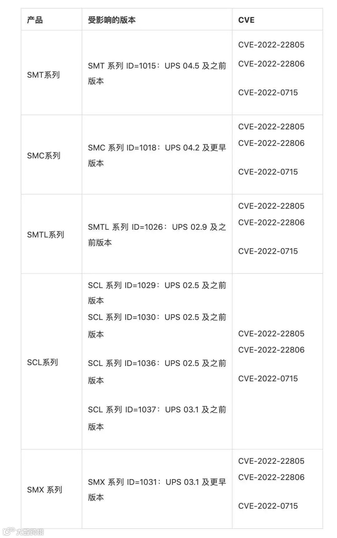 3月11日消息,据国家监测部门发现,美国电力转换公司(简称APC公司)的不间断电源(简称UPS)设备中存在3个高危漏洞,漏洞编号分别为CVE-2022-0715、CVE-2022-22805、CVE-2022-22806,漏洞影响涉及SMT、SMC、SCL、SMX、SRT和SMTL系列产品。