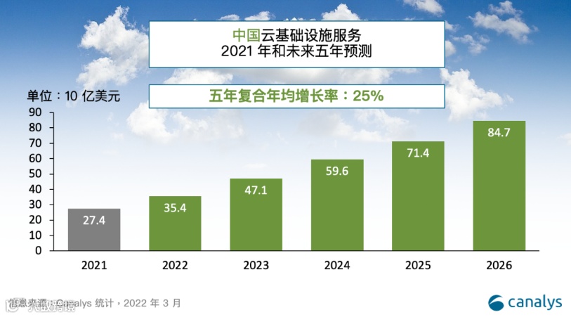 Canalys 预计,到 2026 年,中国大陆的云基础设施市场将达到 850 亿美元,五年复合年均增长率将达到 25%。