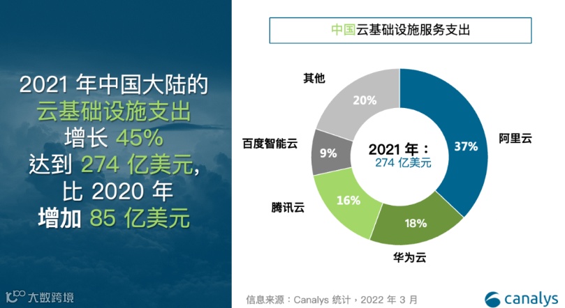 2021 年中国大陆势头强劲,云基础设施服务市场增长 45%,总计达到 274 亿美元。