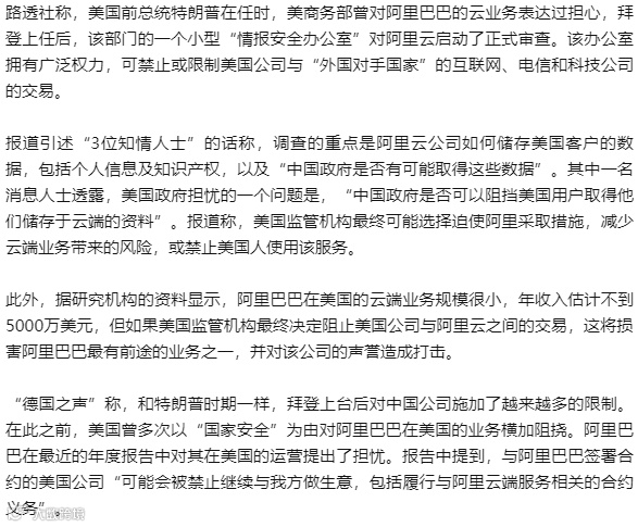 1月20日消息,据路透社报道,美国政府正在审查中国电子商务巨头阿里巴巴的云存储业务,以确定它“是否对美国国家安全构成风险”。消息人士称,美国监管机构可能禁止美国人使用阿里云业务。