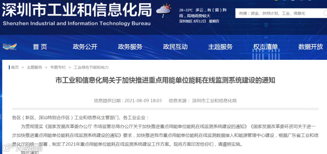 深圳市工业和信息化局发布关于加快推进重点用能单位能耗在线监测系统建设的通知。
