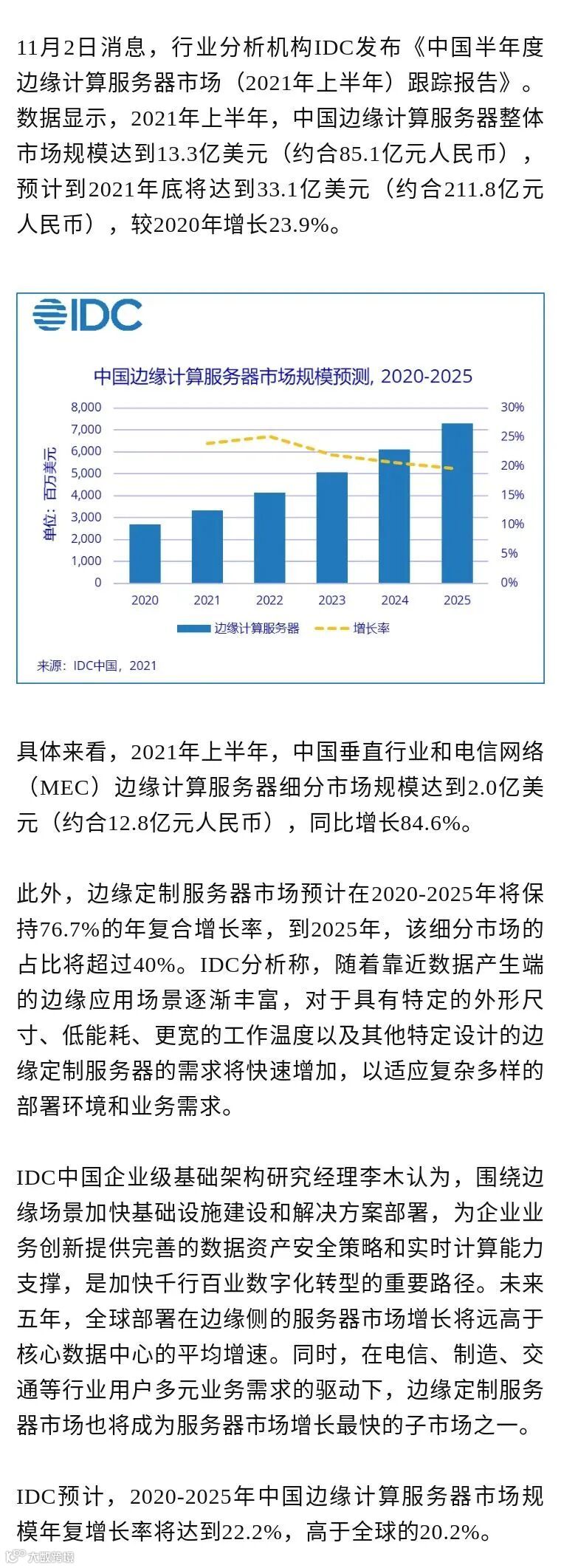 2021年上半年,中国边缘计算服务器整体市场规模达到13.3亿美元,预计到2021年底将达到33.1亿美元。