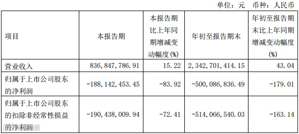 其中,第三季度实现营收8.37亿,同比增长15.22%,归属于上市公司股东净利润为-1.88亿,同比下降84%。