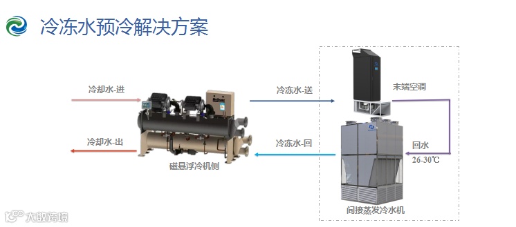 冷冻水预冷解决方案,把间接蒸发冷却及在冷冻水回到冷机之前对它进行预冷,预冷后的冷冻水温度低于湿球温度,结合其他绿色节能设计可以保证较低的PUE。