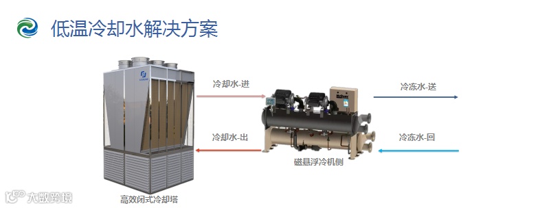 低温冷却水解决方案核心是用高效闭式冷却塔,出水温度比较低,比常规开式塔水温低2度,耗水量低,是常规开式塔的三分之一。再结合其他绿色节能设计,保证电能比PUE年均值低于1.25,在干冷地区可以到1.15以下。