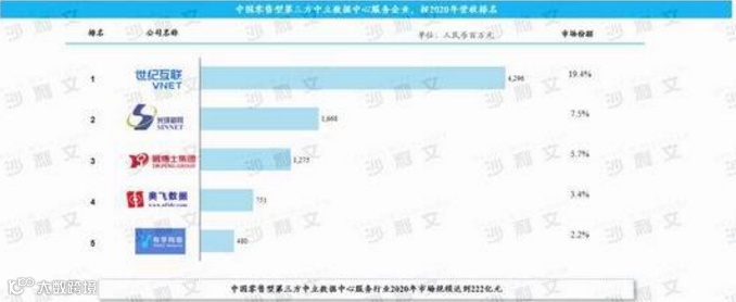 2020年,我国零售型数据中心规模达到222亿元,世纪互联以19.4%的市场份额位居中国零售型第三方中立数据中心第一位。