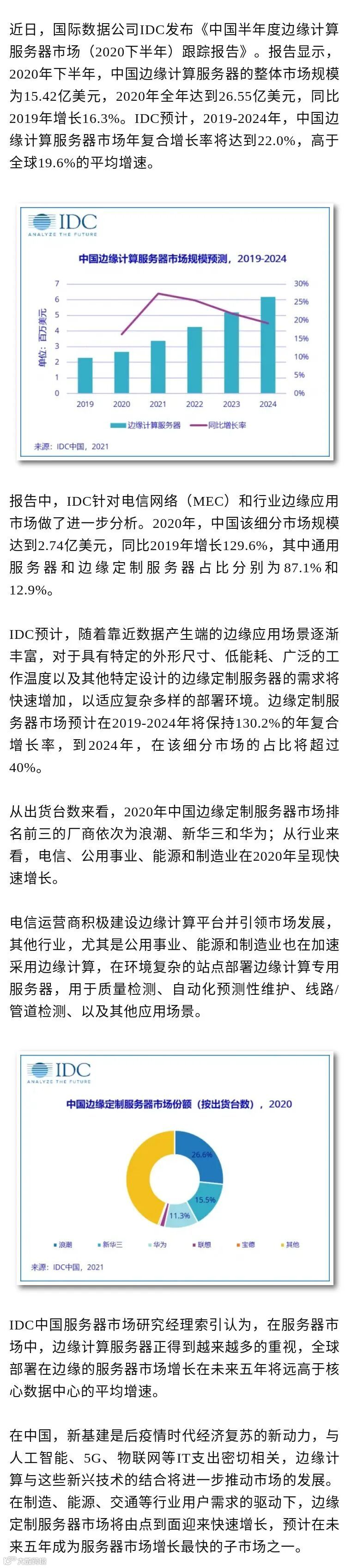 2020年下半年,中国边缘计算服务器的整体市场规模为15.42亿美元,2020年全年达到26.55亿美元,同比2019年增长16.3%。