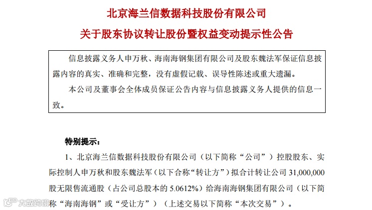 近日,海兰信的控股股东、实控人申万秋与公司第三大股东魏法军,计划向海南海钢集团有限公司(以下简称“海南海钢”)合计转让公司3100万股无限售流通股,占公司总股本的5.0612%。转让价格相较于协议签署前一个交易日的收盘价折价20%,交易总价约为2.59亿元。