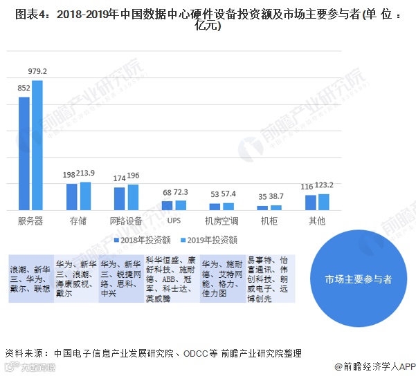 2019年,数据中心行业IT投资规模达到3698.1亿元,其中以硬件产品和服务为主。硬件产品中,服务器、存储、网络设备占据较大份额,重点厂商代表包括华为、新华三、浪潮等。