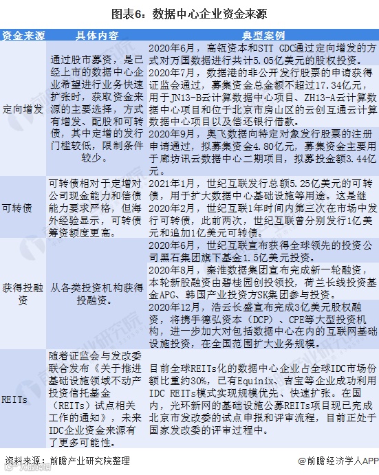 数据中心为重资产行业,投资大,建设周期长,前期出租率低,电费高,导致投资回报周期普遍长达多年,因此,数据中心企业的快速规模扩张需要大量资金,其获得资金来源的投融资方式总结及2020年典型投资事件案例如下: