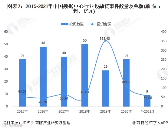 从第三方数据中心服务商投融资情况来看,根据IT桔子统计数据显示,2015-2020年,中国数据中心行业投资数量呈波动变化趋势,2018年达到近年峰值50起,2020年投资数量为38起,较2019年有所上升,说明行业投资有所回温。