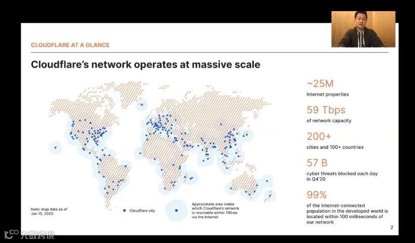 首先,Jeremy Yang表示在过去的10年中,Cloudflare已经逐渐构建起了一张属于自己的基础设施网络图,在100个国家地区、超过200个城市都建立了Cloudflare自己的网络和数据中心,这也就意味着Cloudflare具有三大能力——网络接入的能力、DDos防御大流量能力、大的PPS攻击的能力,此外根据最新数据显示,Cloudflare的网络容量达到了59Tbps,同时DDos攻击的容量也达到了59Tbps。