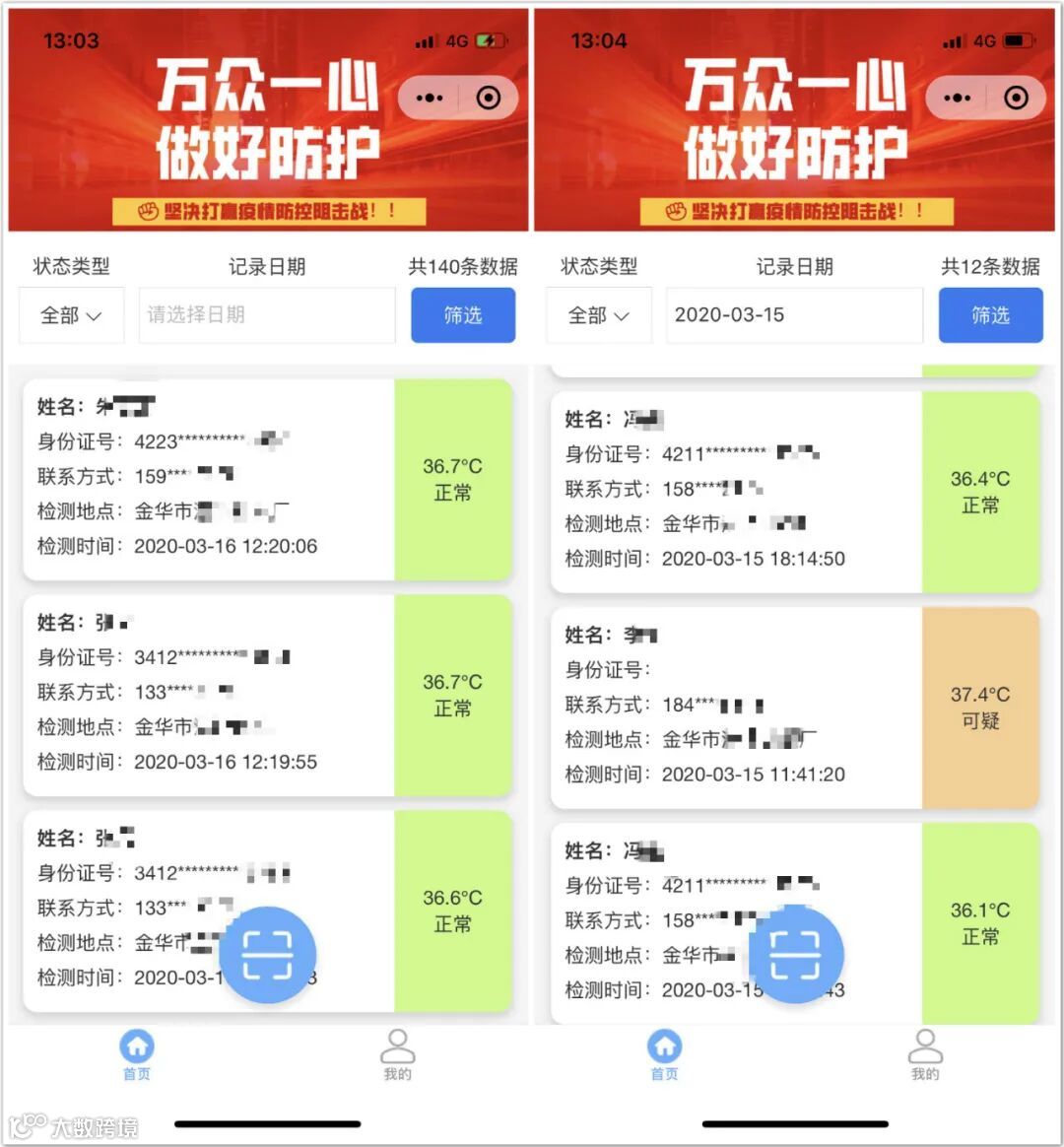 学校安保人员关注小程序“行者通”,可以实时查看当前家长或来访人员的体温登记信息,学校属于严格检测区域,安保人员可通过“行者通”查看当前人员是否可疑(从湖北过来、体温不正常、经过地有确诊人员等)。