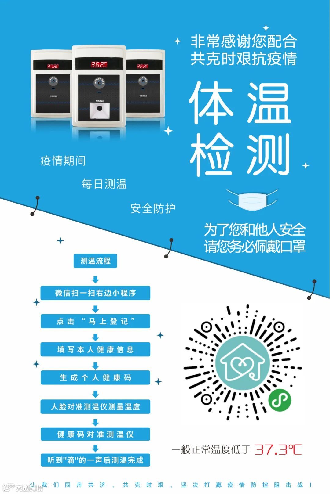 进出人员佩戴口罩通过,距离物联测温仪 60cm 范围内时,设备判断有人靠近,启动自动测温功能,并将温度实时显示在底部,同时背面工作人员也可看到当前温度值。当温度低于 37℃(可设置)时,蜂鸣器“嘀”一声,提示识别到正常温度,测温通过。当温度高于37.3°C时,设备发出蜂鸣器连续急促“嘀”声提醒,工作人员用体温枪进行再次确认并执行相应措施。
