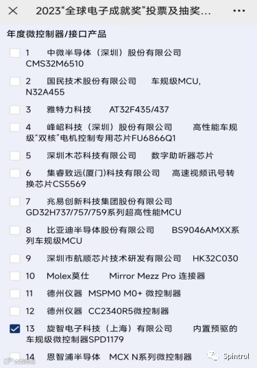 2023年度全球电子成就奖网络评选已经正式开启,旋智科技内置预驱的车规级微控制器SPD1179入榜“年度微控制器/接口产品”类提名。诚邀模拟芯片领域从业翘楚参评,为旋智科技投上您宝贵的一票,投票即可参与主办方的抽奖活动。