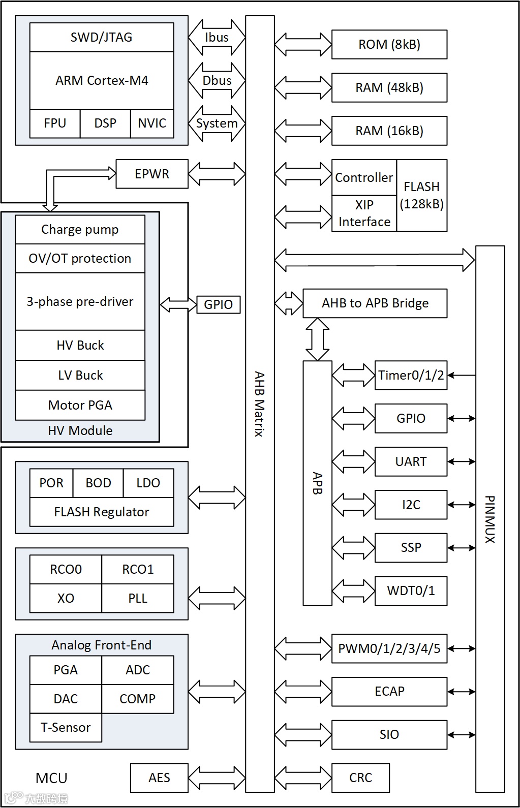 预驱模块:集成3相供电电压高达96V的预驱,2A可调上下拉能力,集成自举二极管,集成电荷泵可提供100%占空比
