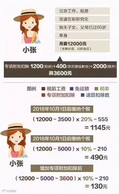 结论:2018年10月开始,小张每月可先少缴个人所得税655元,增加专项附加扣除后,每月再少缴360元(相当于每年4320元)。