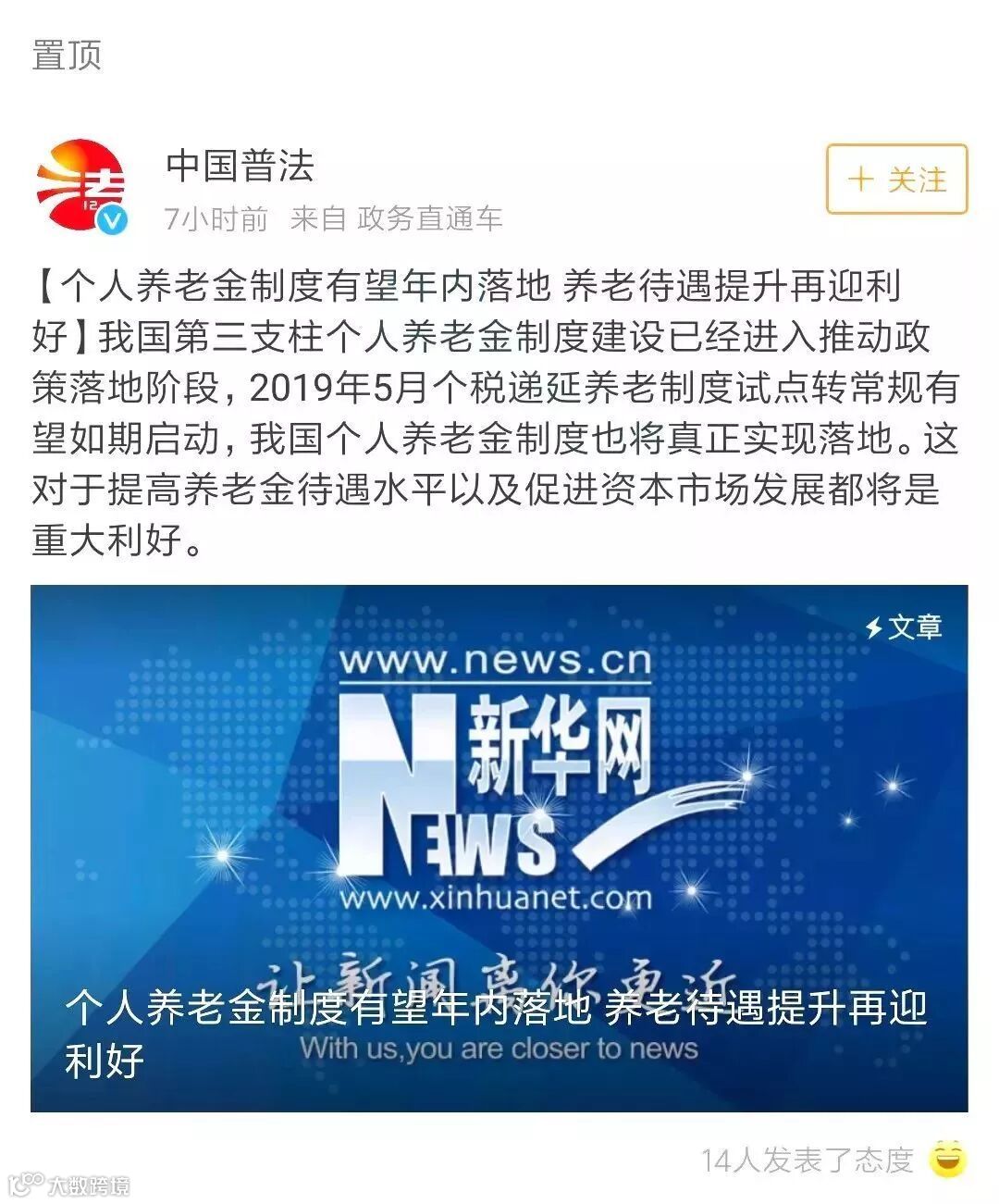 根据新华网的消息,我国第三支柱养老金制度建设已经进入推动政策落地阶段,2019年5月个税递延养老制度试点转常规有望如期启动,我国个人养老金制度也将真正实现落地。这对于提高养老待遇水平来说是重大利好!