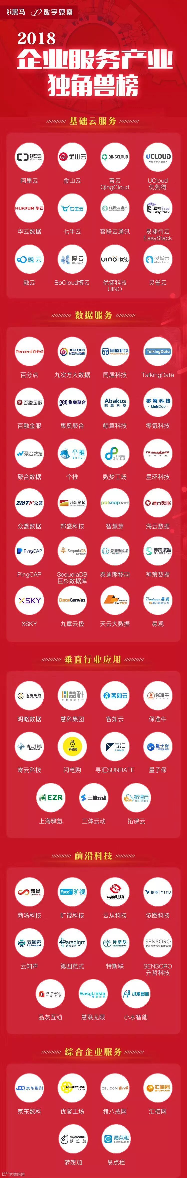 据了解,i黑马&数字观察联合30多家机构,包括企业服务产业协会、咨询机构、产业媒体和产业投资机构等,发起“2018中国企业服务产业独角兽评选”。评选期间,有超过400家2B企业报名,130家估值上亿美元的头部企业多轮深入参与评选,投票人次达上百万,成为2018年企业服务产业参与度最高,头部企业最集中的评选之一。最后,100家2B企业入选《2018中国企业服务产业独角兽》榜单。