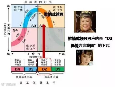 “推销型领导”对应的是D2型下属,低能力高意愿,领导不但要用“高工作行为”指导他们具体怎么做,更要用“高关系行为”保护他们的工作积极性。