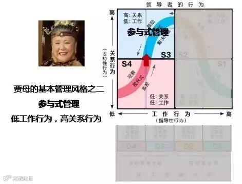 我们发现,当了董事长的贾母的基本管理风格是“授权型”和“参与型”,特殊情况下,她也会直接站到前台,成为“推销型”和“告之型”领导。