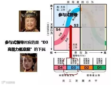 所以,“参与型领导”对应的是D3型下属——高能力低意愿。贾母从“授权型领导”切换成“参与型领导”,往往是因为王熙凤心态的变化。