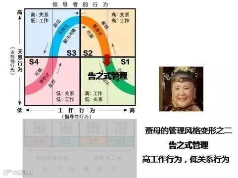 此时贾母的管理风格就变成了“高工作行为高关系行为”的“推销型领导”:高工作行为——直接指出工作中具体存在哪些不足,高关系行为——耐心地解释领导不作为的危害。