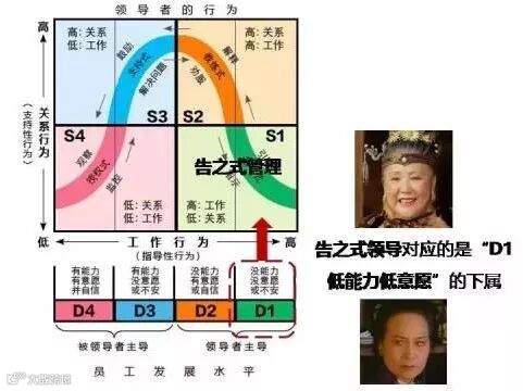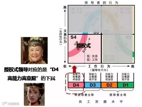 “情境领导理论”,认为“领导者”通常有四种影响“被领导者”的基本模式:授权式、参与式、推销式、告之式。这四种模式分别对应了四种下属:D4高能力高意愿、D3高能力低意愿、D2低能力高意愿和D1低能力低意愿。