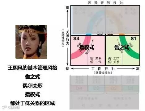 王熙凤的基本管理风格是“告之型”,当面对平儿这个能力又高又忠心的心腹时,她也会变成“授权型”,但她基本上不会变成“参与型”和“推销型”,也就是说,她的管理风格过于强势,缺少鼓励、倾听、信任等“高关系手段”。