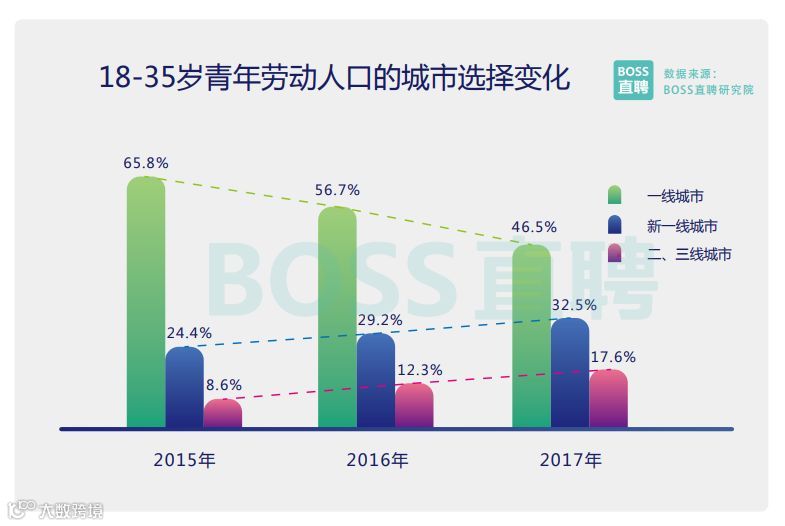 BOSS直聘研究院数据显示,近三年来,工作首选城市为北上广深的18-35岁青年劳动者比例迅速下降,从2015年的65.8%下降至2017年末的46.5%。选择新一线城市的青年劳动者比例直线上升,选择二三线城市的年轻人比例也较2015年翻倍。