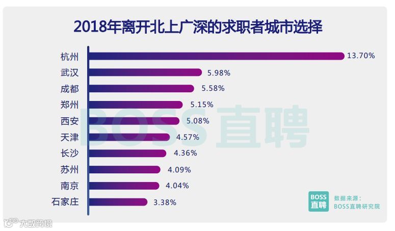 Useit知识库从报告发现,2018年前两个月,北上广深人才继续流出至二三线城市,净流出率达到0.6%。2018年离开北上广深的求职者,有35.5%的人选择了这五所城市选择了杭州、武汉、成都、郑州、西安这五个城市,成为“新一线”城市抢人的第一集团。从北京离开的求职者,下一份工作的地区分散度最高,其范围横跨西南和东部沿海城市,呈“全国撒网”式特点。而从上海、深圳和广州离开的求职者,下一份工作地区集中度相对较高,超过60%的人选择周边二线/省会城市及珠三角地区。