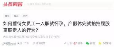 @天火Jetfire127779822:之前做部门经理,手下4个男生,7个女生。某一年,7个女生突然全部怀孕,2~7个月。工作没法开展了,7个准妈妈,今天A产检,明天B休假,后天C不舒服……坐在一起就聊育儿经、保胎经,办公室里放满了妇婴用品。只能赔点钱,劝她们走人,生完孩子回来也不会好好干活。