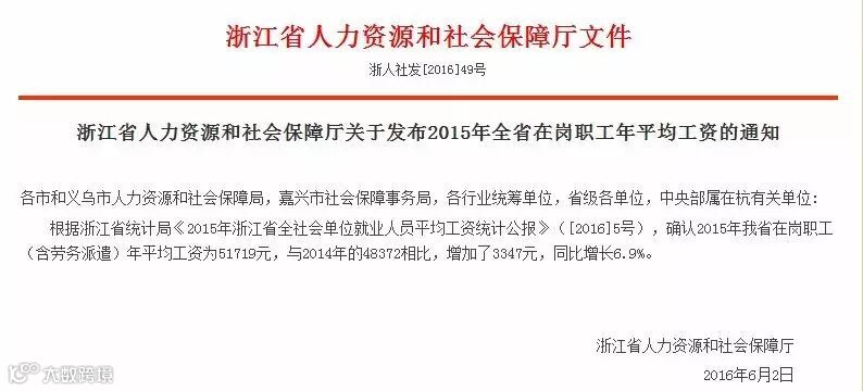 根据浙江省人社部最近发布的文件,2015年度浙江省在职员工年平均工资为51719元。