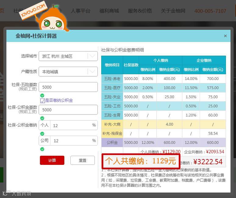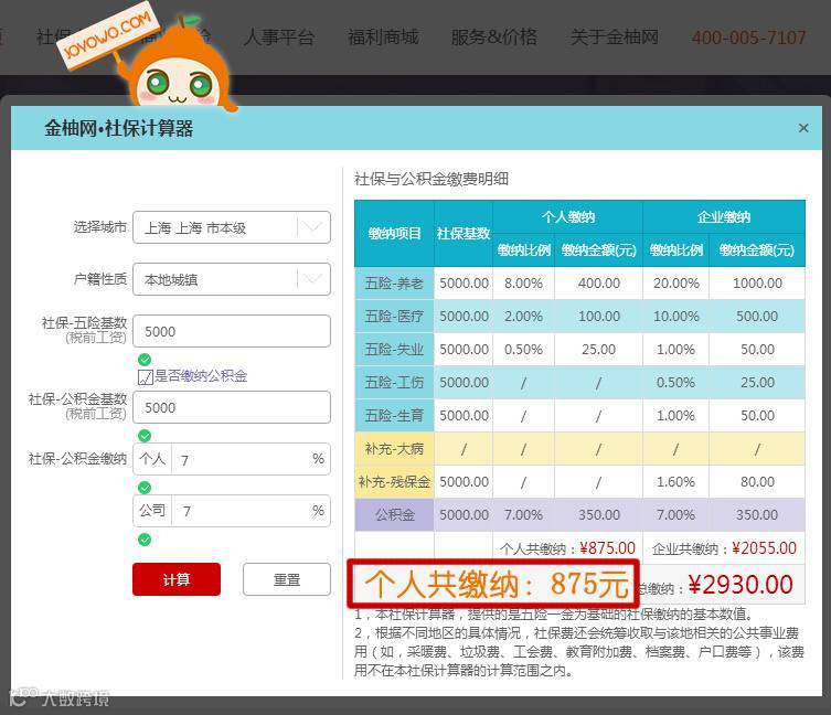 (图片来源:金柚网官网www.joyowo.com的社保计算器截图)