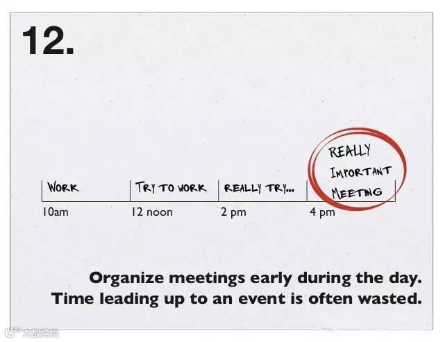 12、有会议就尽早安排,用于准备会议的时间往往都浪费掉了。
