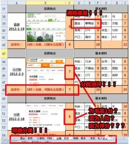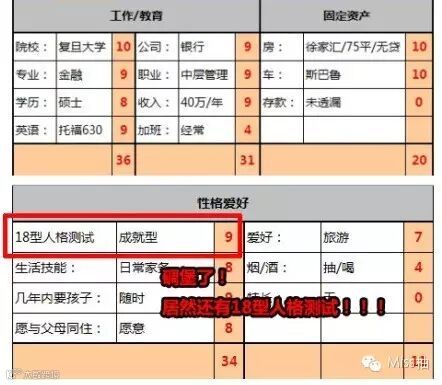 在这本相亲手册中,还把所有相亲对象按行业进行了分类(classify):国企、金融、计算机、网络、老板、私企……更牛的是,这位丈母娘每一项都按1-10进行评分,并计算出总分,只有达到合格的才能得见女儿的芳容。有一位来自福州的小伙子魔蝎座、体型匀称,情史4次最终获得未来丈母娘的欢欣,总分获得190分,得到了与该女儿见面的机会。而丈母娘竟然还精通(expertin)“18型人格测试”,在每一个小伙子的背景后还增加了这项测试,有小伙子获得了“成就型”的评语,但也有小伙子因为通不过人格测试而被无情淘汰(eliminate)。