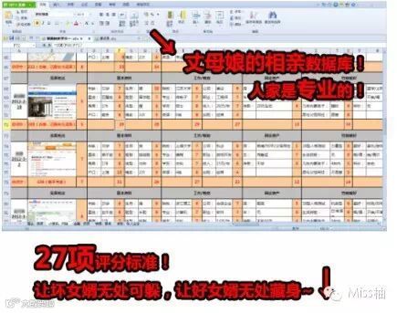 史上最牛丈母娘的这条微博分为两部分,第一部分是一份excel的表格,上面包括了相亲时间、地点,相亲人的姓名、年龄、身高体重、生肖(Chinese zodiac)、户口、情史、体型、脸型(feature)、毕业院校、专业、学历、英语、公司、职业、收入、加班、18型人格、生活技能等27项标准(standard)。