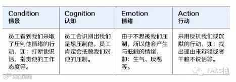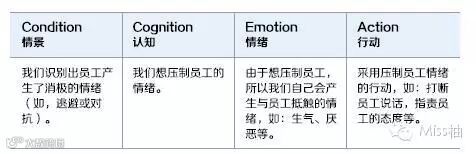 利用CCEA模型来分析情绪来源。根据CCEA模型,我们知道情绪来源于人们对目前状况(Condition)的认知(Cognition),所以通过与员工沟通当时的状况以及员工的认知,就可以帮助我们很快地定位到情绪的来源,进而进行处理。