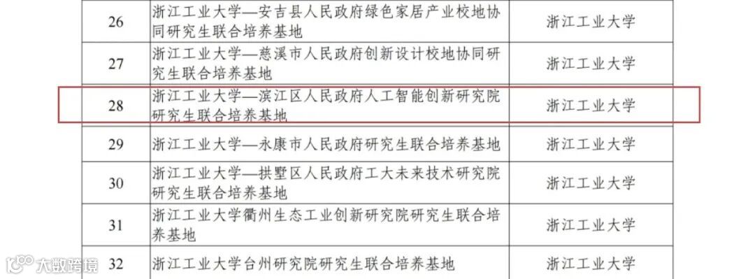2024年12月13日,浙江省教育厅办公室公布2024年浙江省研究生联合培养基地认定结果,浙江工业大学-滨江区人民政府人工智能创新研究院研究生联合培养基地成功认定为浙江省研究生联合培养基地。