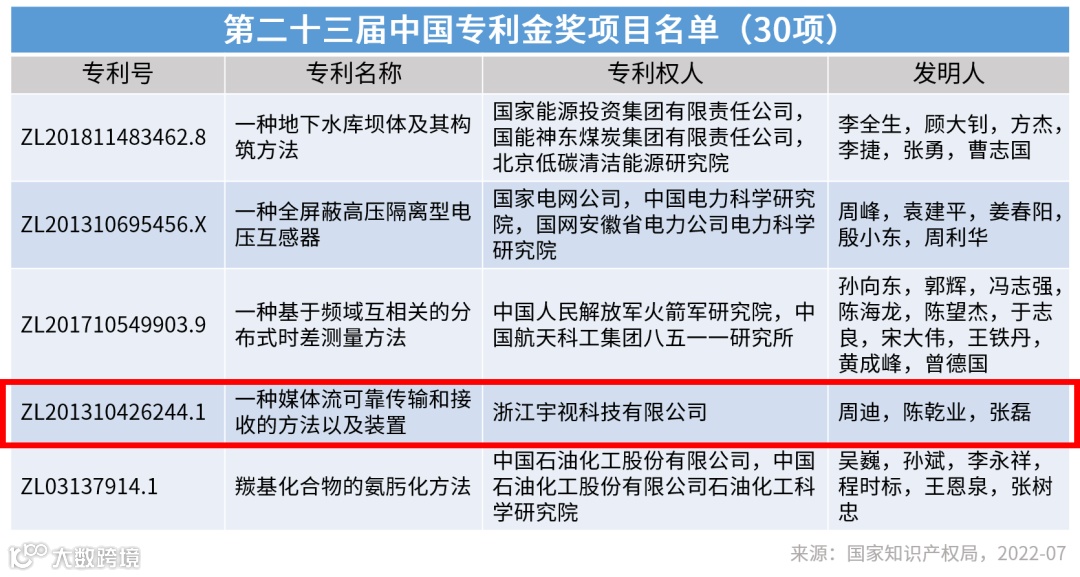 7日26日,第二十三届中国专利金奖正式公布获奖名单,该奖项是国家专利领域的最高荣誉,宇视科技以《一种媒体流可靠传输和接收的方法以及装置》发明专利荣膺金奖,成为行业首家获此殊荣的企业。