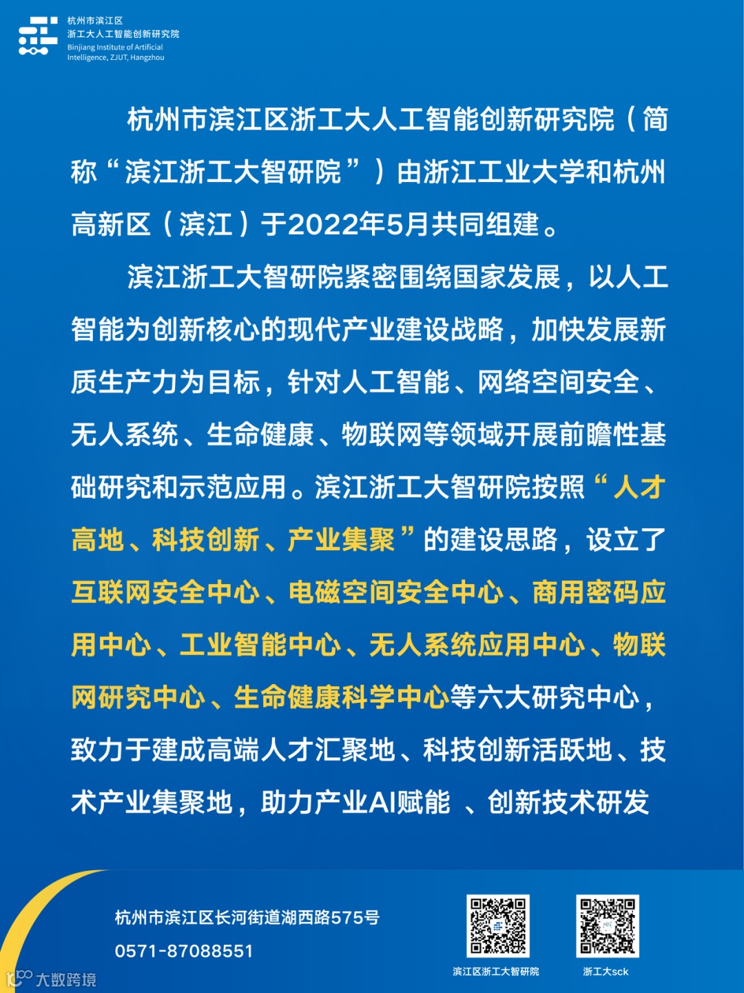 杭州市滨江区浙工大人工智能创新研究院是由杭州高新区(滨江)和浙江工业大学共同发起建立的科技创新平台。聚焦人工智能、大数据、网络空间安全、无人系统、电磁空间安全、工业领域等开展前瞻性基础研究和示范应用。
