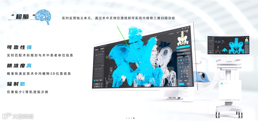 免除参考架的安装使用,避免患者的额外创伤,同时提升术中图像处理效率和精度;创新的术中反馈功能,实时反馈内植入物位置准确性,结合精准手术导引,双重提升手术安全。