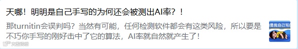我们都知道,Turnitin检测是针对所上传的文档全部内容。所以即便文章的某段已经AI率降为0,且你也没有对其降后内容进行过任何更改,但因为放回文章后再次上传到Turnitin,检测的内容发生了变化——由原先的某段变成了整篇,那么算法也会随之调整,所以它有一定概率会再次引起AI产生。