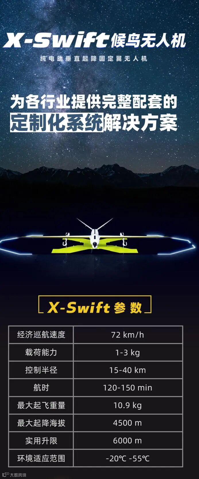 X-Swift是一款垂直起降、水平飞行的高性能纯电动无人机,它融合了固定翼与多旋翼无人机的特有优势,无需跑道即能在狭小场地内快速起飞,同时具备航时长、距离远、速度快等特点,适应行业新需求。