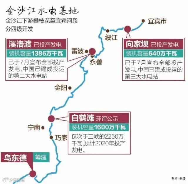 然而,金沙江段是长江上水能蕴藏量最大的一段,进入新世纪以来,三峡集团在金沙江上进行梯级开发,在下游建设了四座巨型梯级水电站——乌东德、白鹤滩、溪洛渡、向家坝,铸就新时代大国重器。