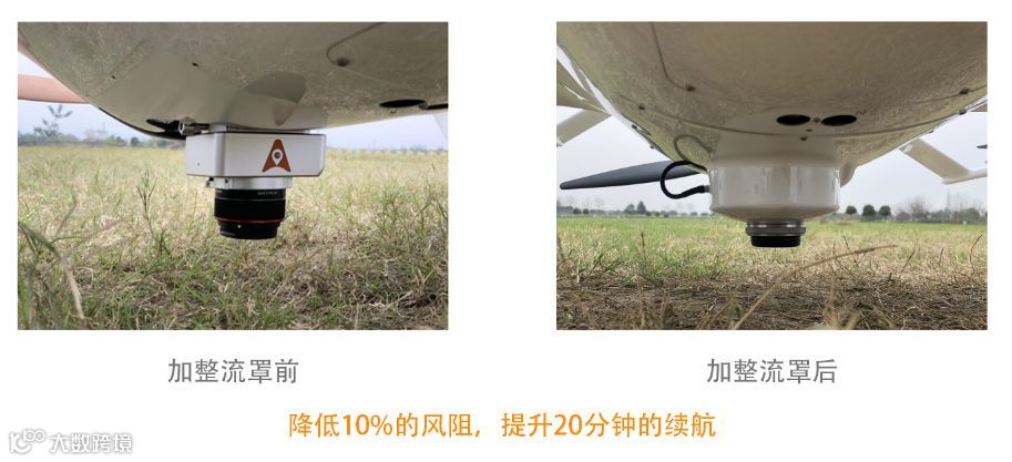 由于相机凸了出来,为了减弱相机风阻,特意设计了下部整流罩,可以极大减小风阻,提升续航;同时也保证了美观,提高飞行效率和飞机安全性。