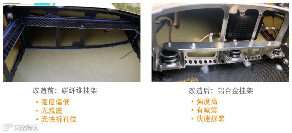 经过以上几个步骤的设计,机舱与激光雷达已经基本适配。但我们发现,原来的碳纤维挂架强度不够高,为了能够让激光雷达更稳定,选用了质量轻、强度高的铝合金材质做挂架,再配合空气减震器,让激光雷达更稳,拆装更快。