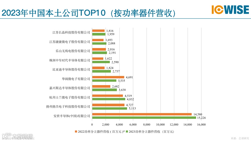 在中国功率分立器件行业前10大公司中,其中有9家公司功率分立器件营收实现增长,也有1家公司营收下滑。在前10公司中,增速大于或等于20%有1家公司,增幅超过50%的公司也有2家,而且营收最少的公司已接近19.5亿元。由于市场不同,导致公司营收变化较大。我们注意到,2023年由于市场整体增长率,各家公司的营收也较为平缓,株洲中车增长59%,一举成为国内营收第7名,江苏捷捷也增长23.3,第一次进入榜单。安世作为中国最大的分立器件生产厂商,其份额在国内继续保持绝对领先,在国际上的排名也大幅上升。