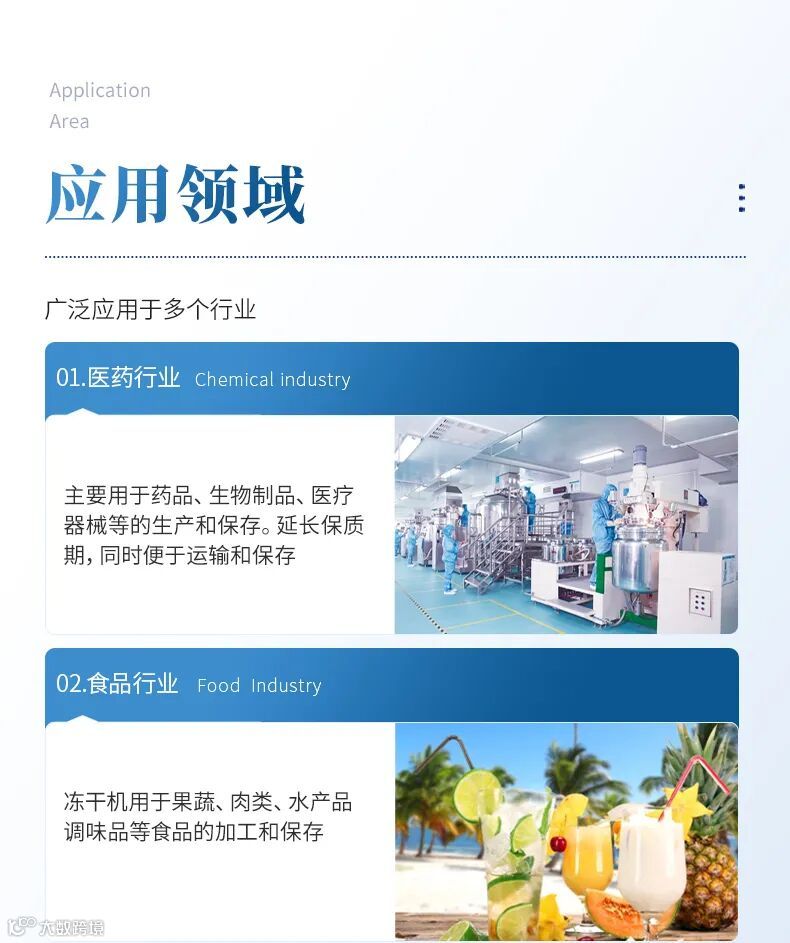 1、医药行业:冻干机在医药行业中应用广泛,主要用于药品、生物制品、医疗器械等的生产和保存。通过冻干技术,可以去除水分,延长保质期,保证药效和生物制品的活性,同时便于运输和保存。