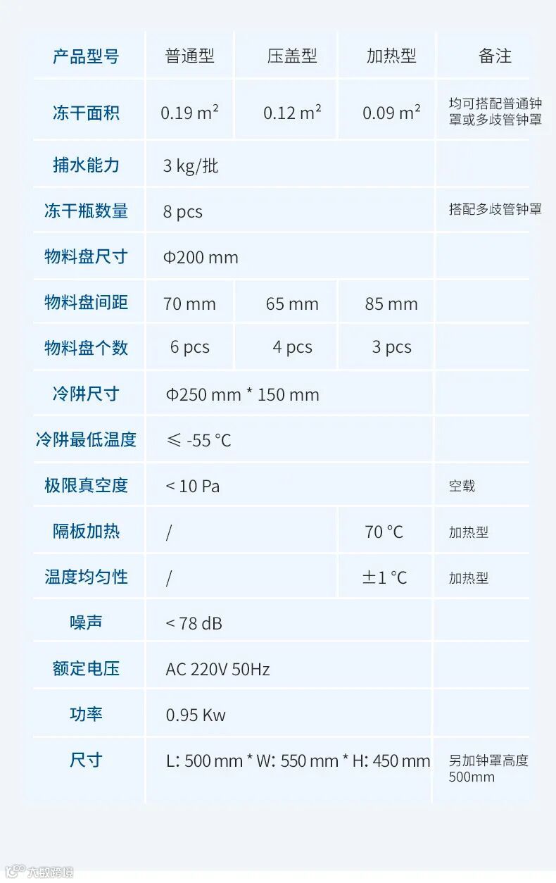 | 冻干面积 | 0.19 m² | 0.12 m² | 0.09 m² | 均可搭配普通钟罩或多歧管钟罩 |